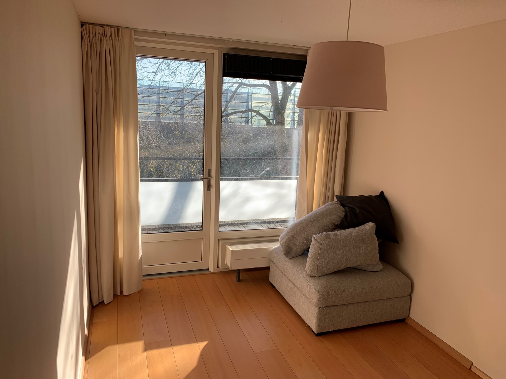 Lichte en verzorgde woonkamer met houten vloer en raampartijen, die voor veel daglicht zorgen. Het balkon is bereikbaar vanuit de woonkamer en de slaapkamer en is gelegen op het zuidoosten met uitzicht op brede groenstrook.
