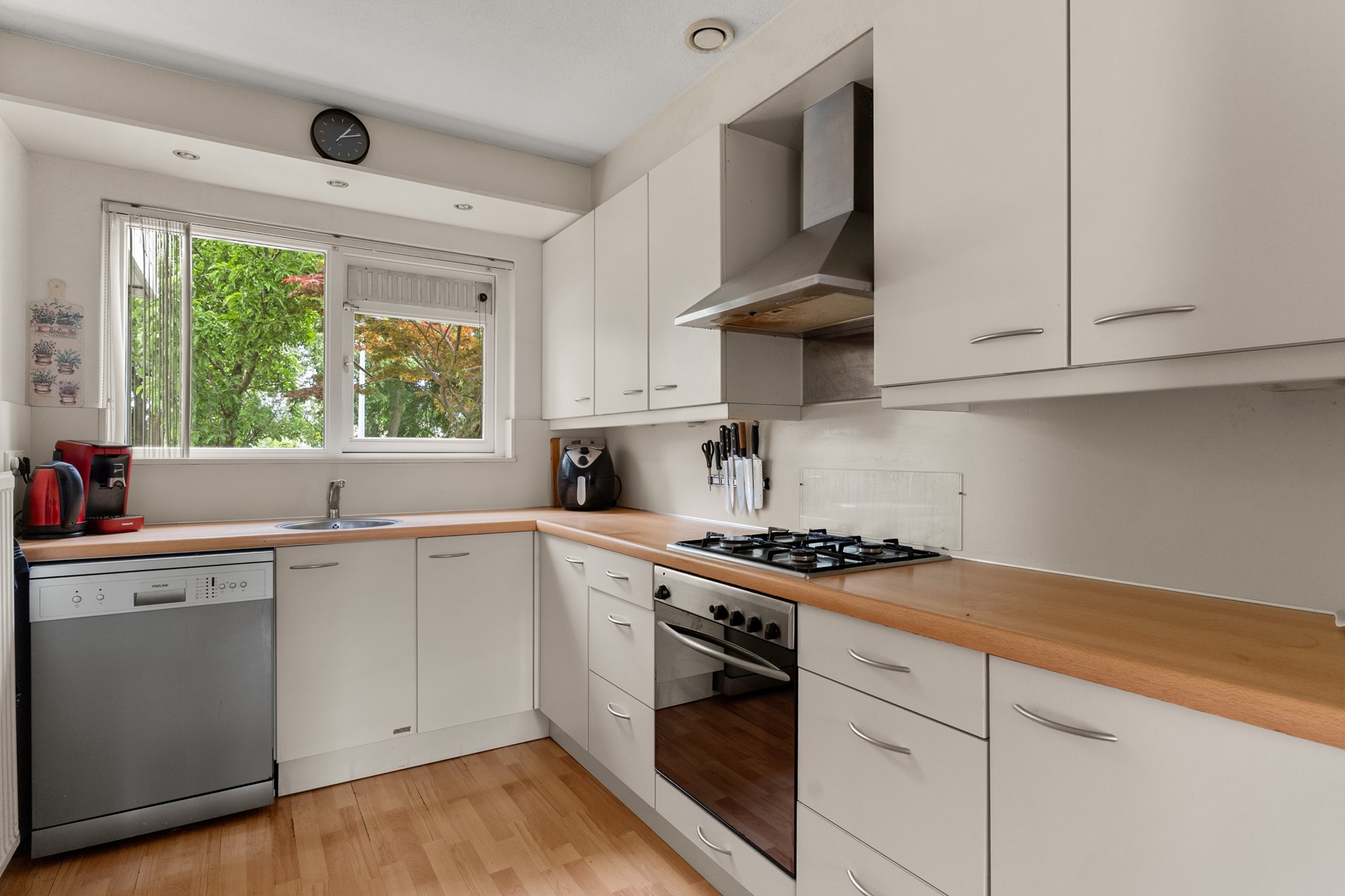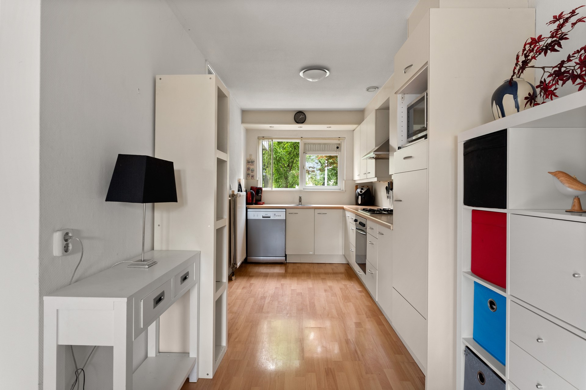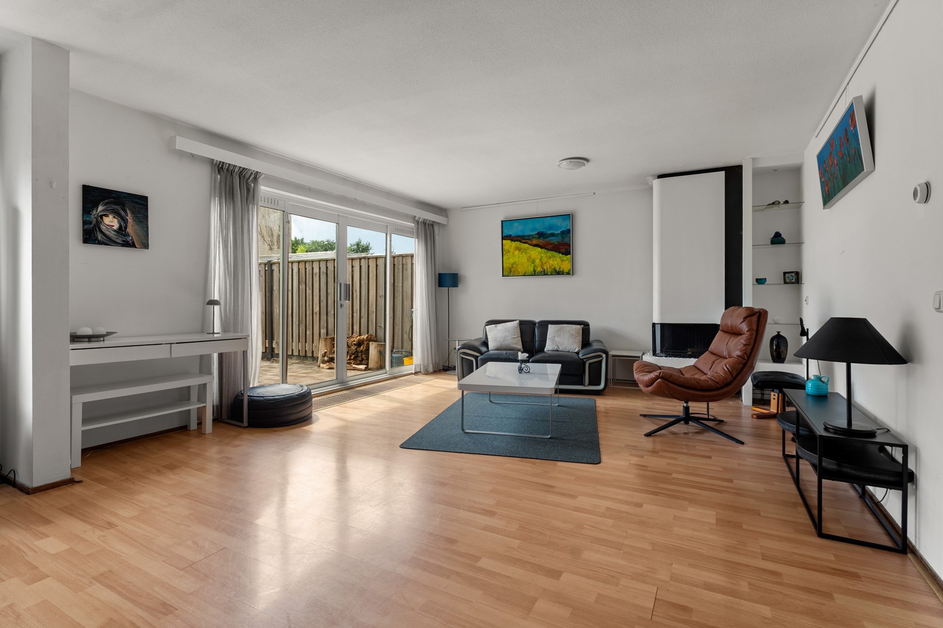 *Ground floor* In the frontyard a roofed front door welcomes you to the hallway. The hallway containing the meter cupboard, restroom and acces to the kitchen, the living room and the indoor garage. The living room is attached to the kitchen which makes for a sizeable ground floor space. It has a fireplace and a big aluminium sliding doors to the backyard providing the room with lots of natural light. The kitchen is equipped with an oven, gas hob stove, extractor hood, dishwasher and sufficient working and storage space. The indoor garage is also accessible through its own segmented garage door at the front of the house connected to the driveway.