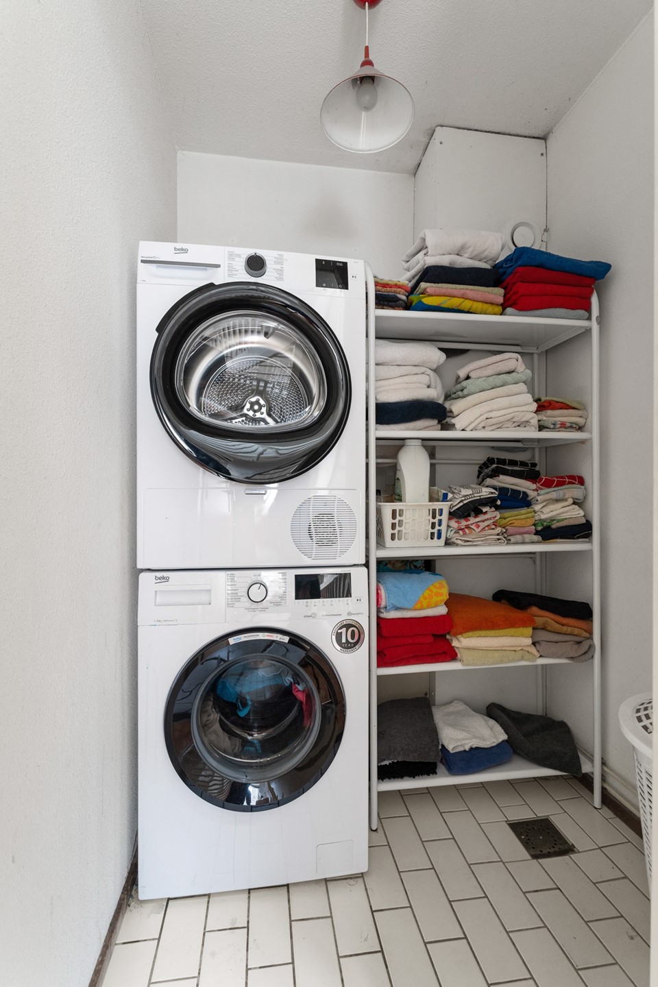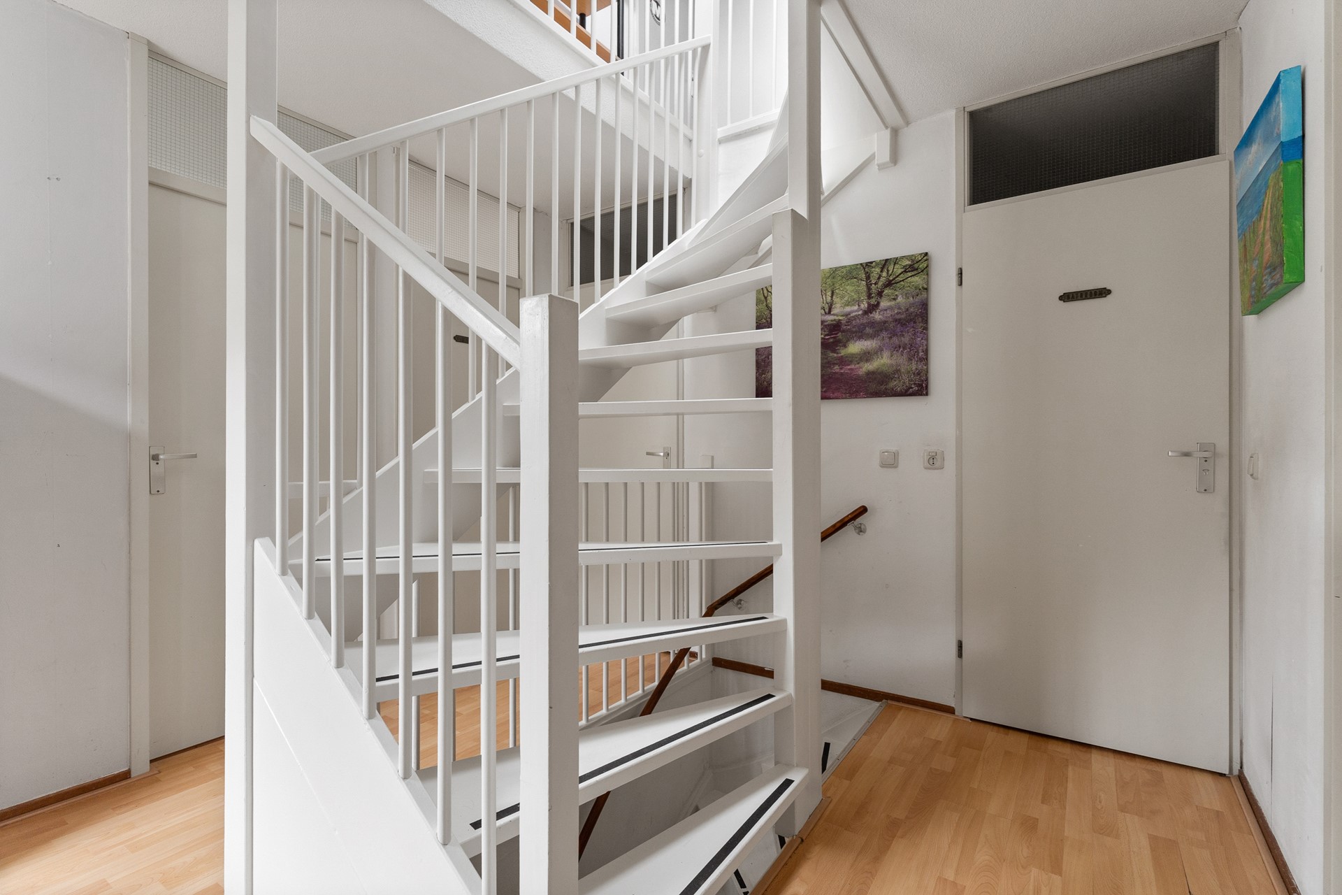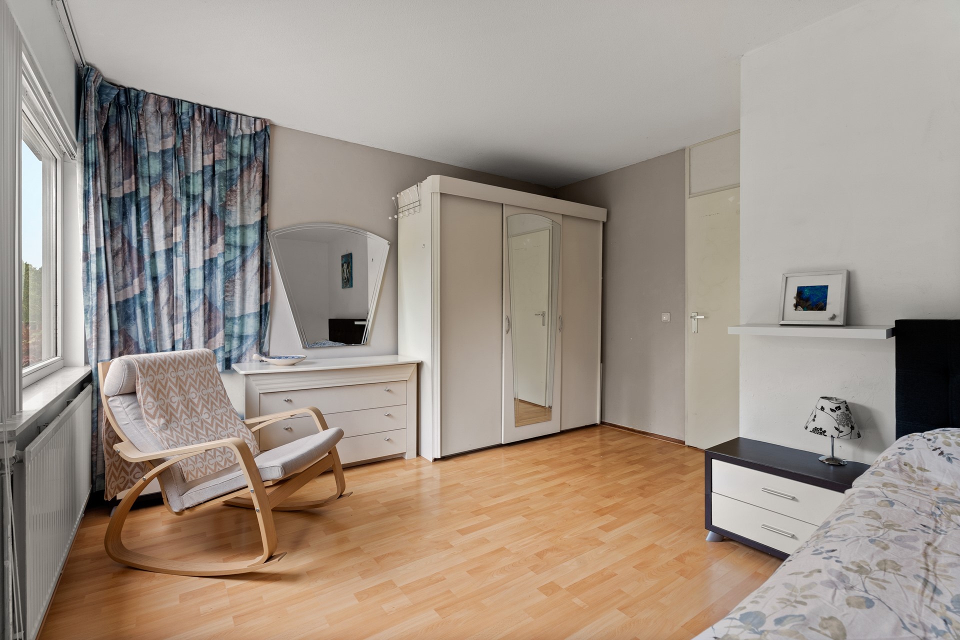 *First floor* The fixed stairs provide access from the hallway to the surprisingly large landing on the first floor. It is connected to three fairly large bedrooms and two 'wet' rooms: one being the bathroom and the other a conveniently situated closet-like room for a washing machine and dryer. The bathroom is fully tiled and equipped with a walk-in shower, a generous bath and a sink. The bedrooms are finished with laminate and the 'wet' rooms with adequate tiles.