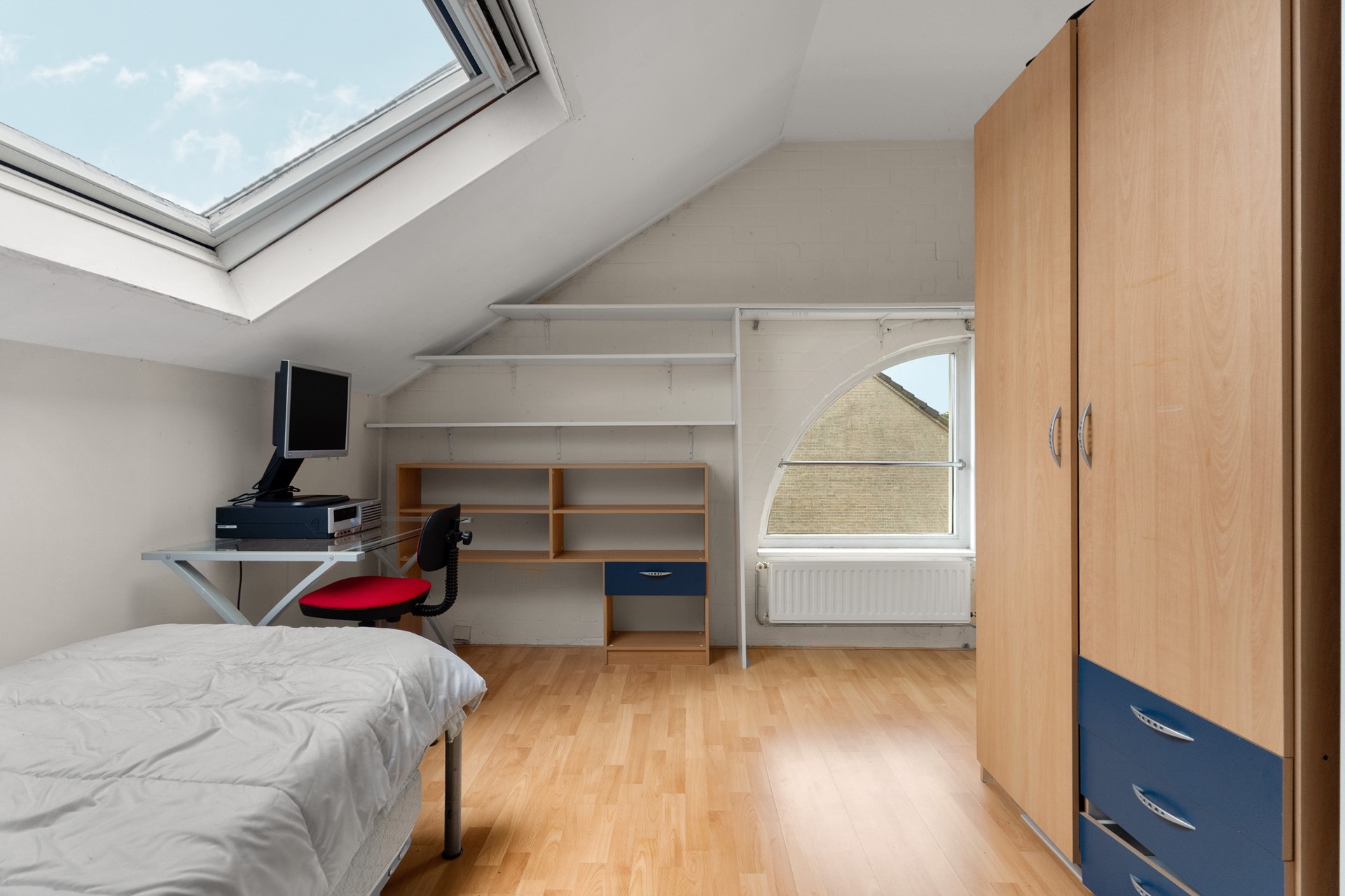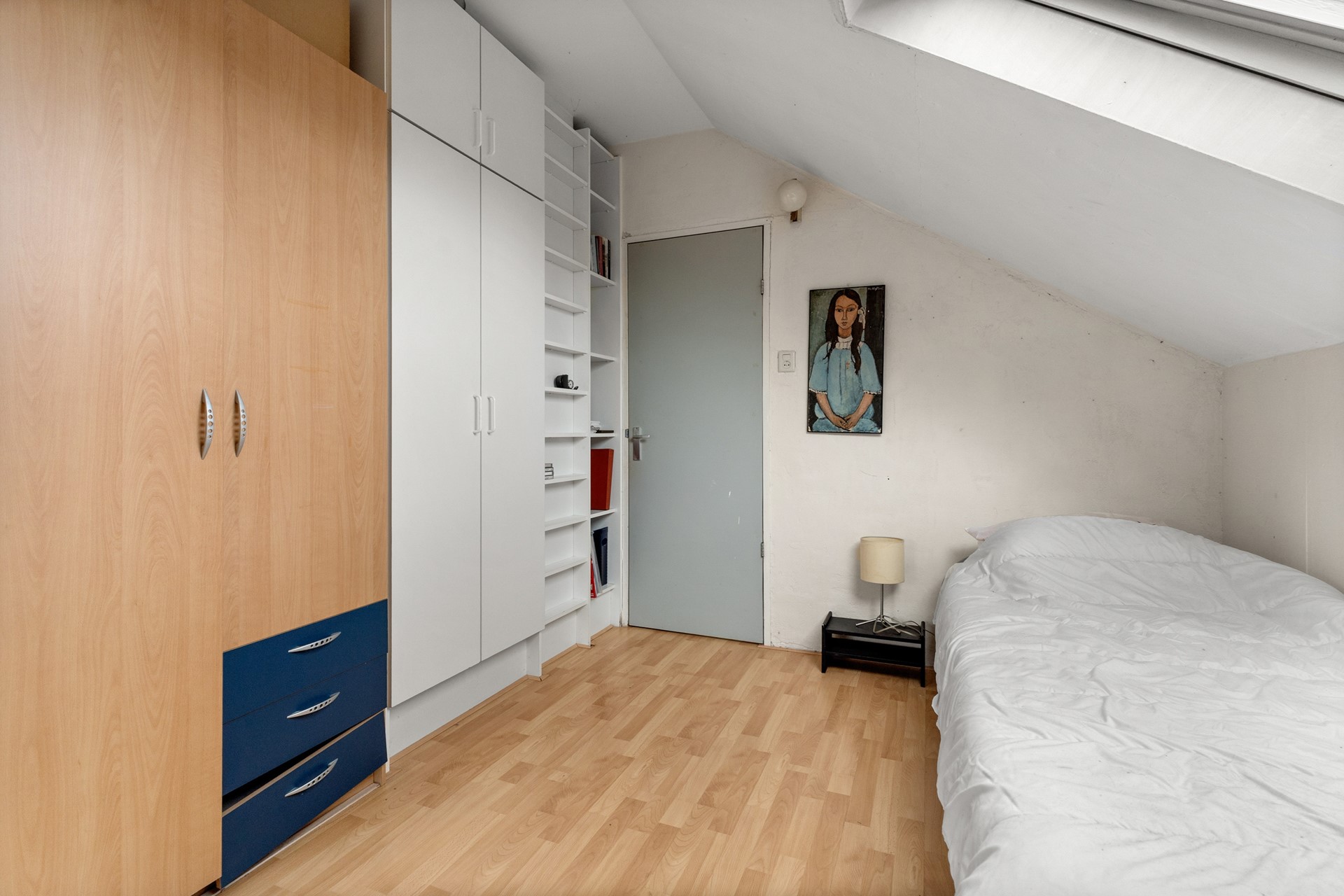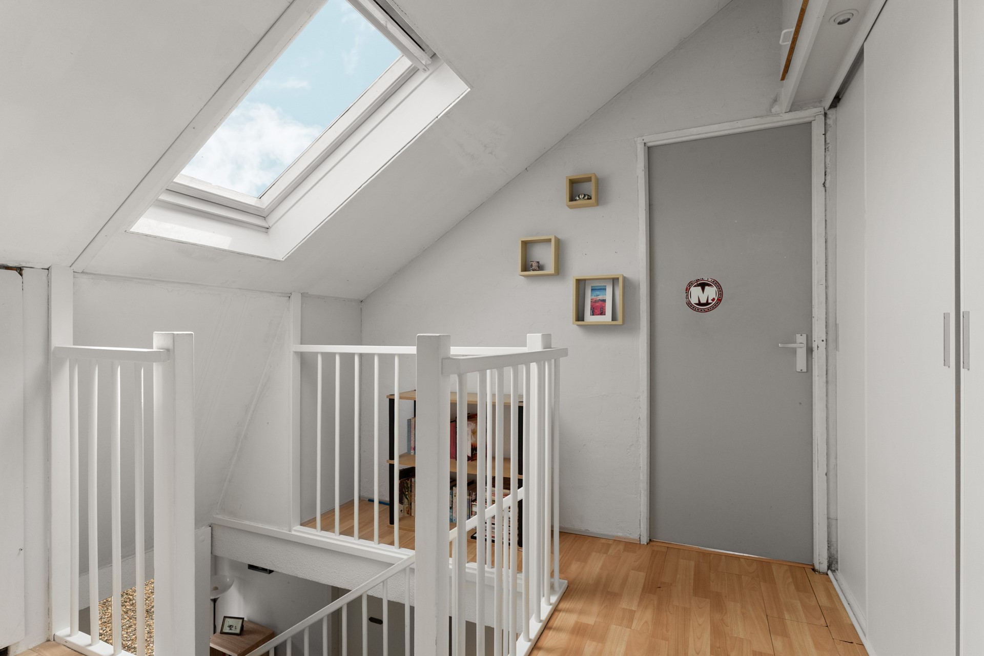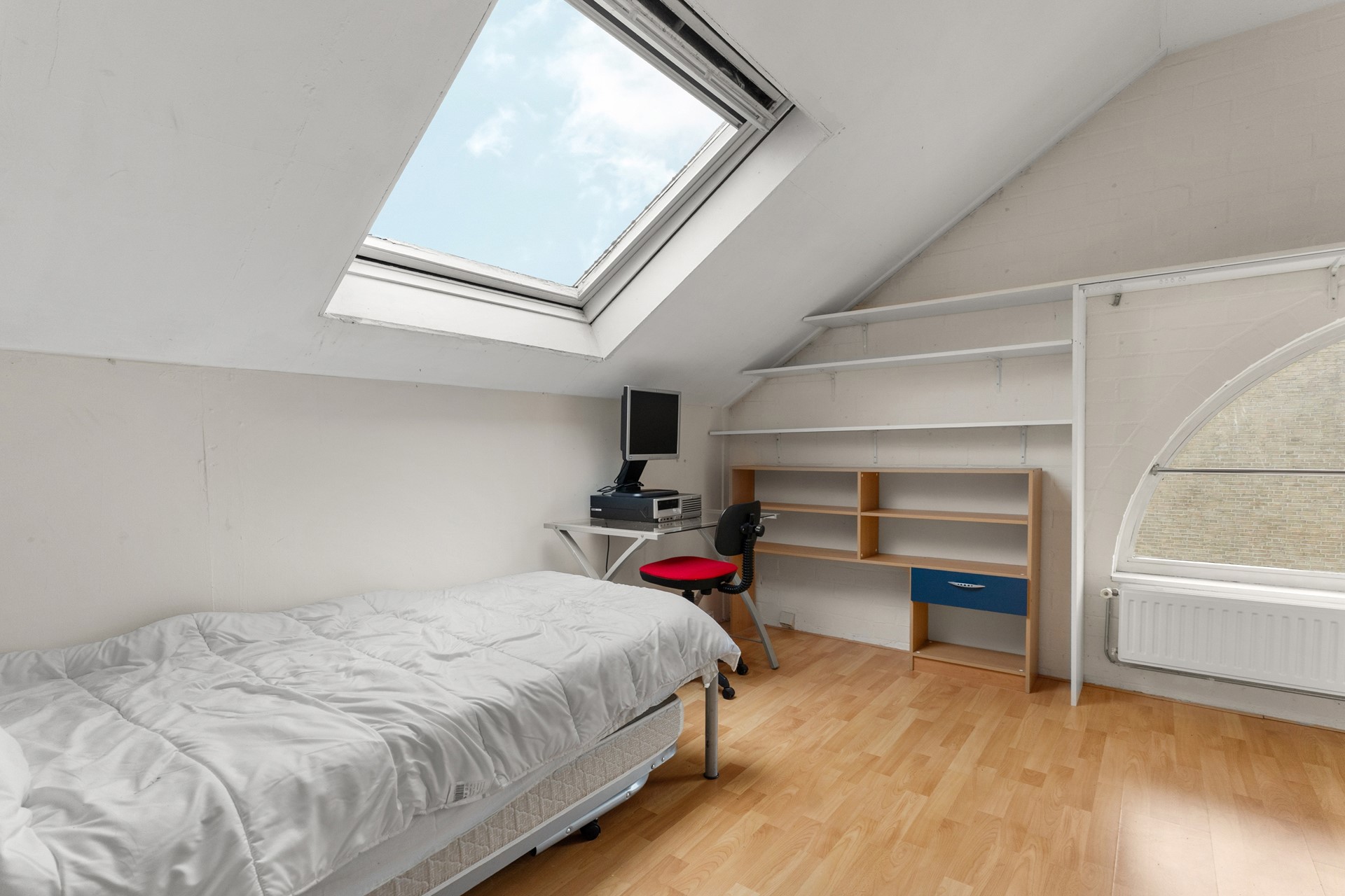 *Second floor* Going up on the second fixed staircase there is another vast floor. It comes with a landing containing the central heating system (neatly situated in a cupboard) and storage space and acces to two more bedrooms. The bedrooms come equipped with both skylights and 'regular' windows on either side of the house making the attic surprisingly well-lit with lots of natural light during the day. The attic is complete with a generous amount of storage space underneath the sloping walls alongside the entire side of the house.