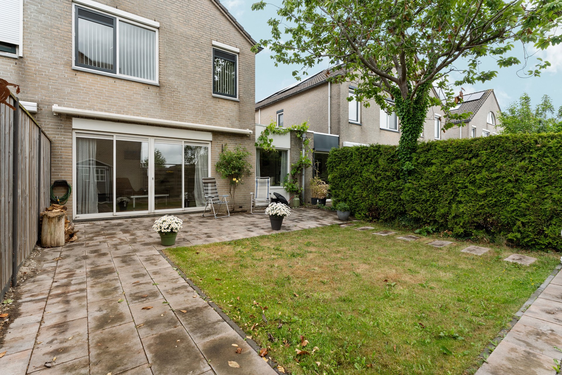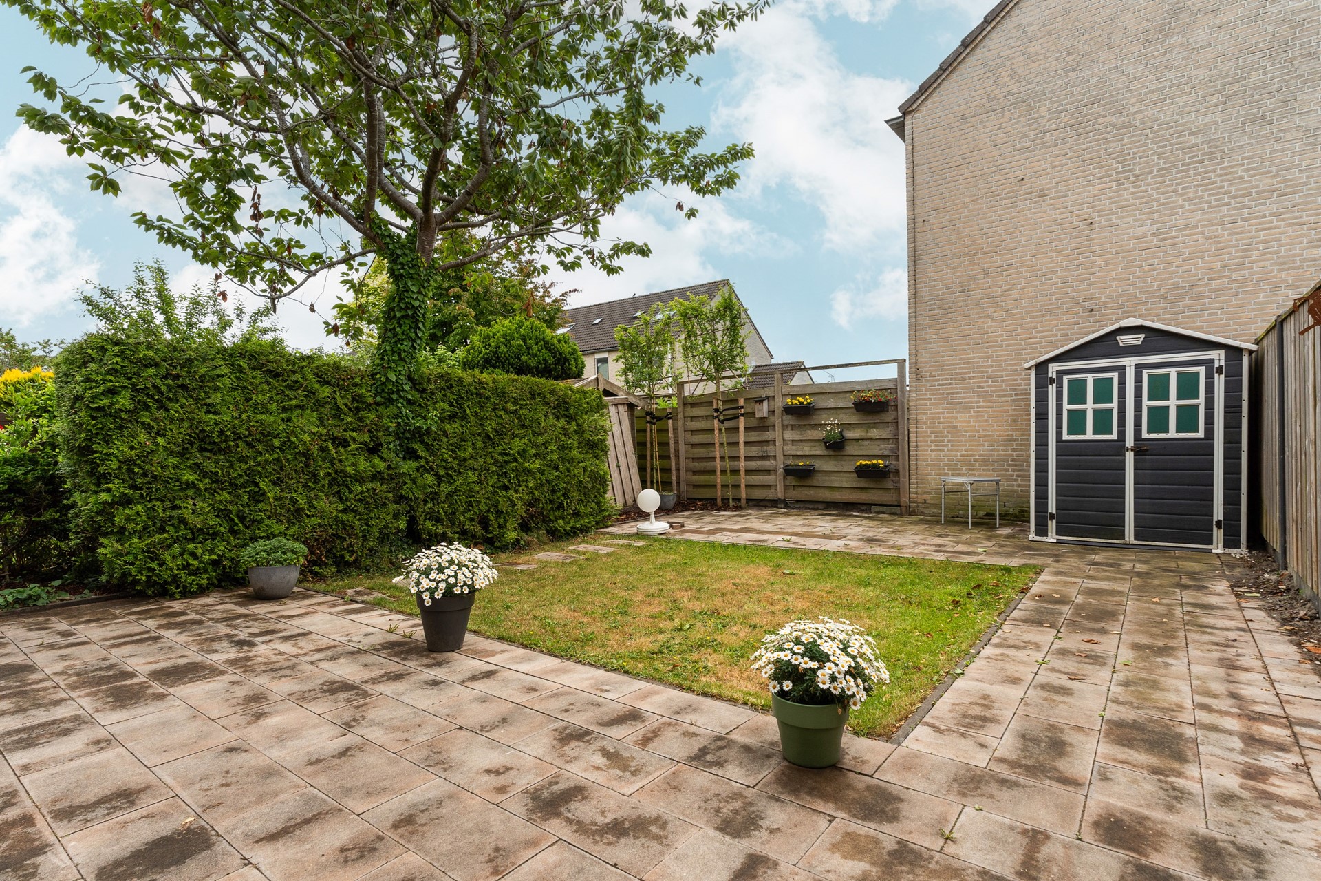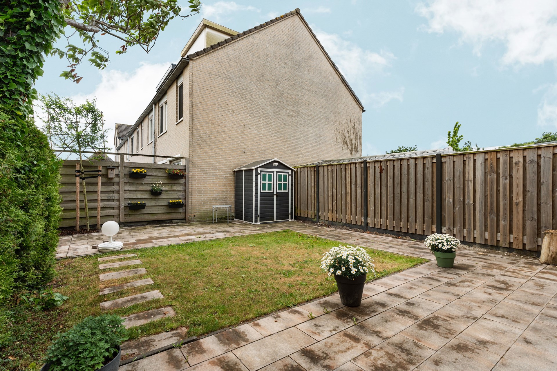 De ruime achtertuin is gelegen op het zonnige zuidoosten en beschikt over een groot betegeld terras, een gazon, een kunststof berging en een nette erfafscheiding met schutting en haag. Ideaal voor tuinliefhebbers en gezinnen met kinderen.